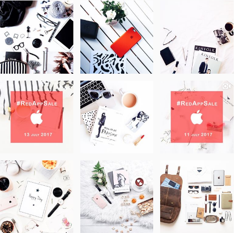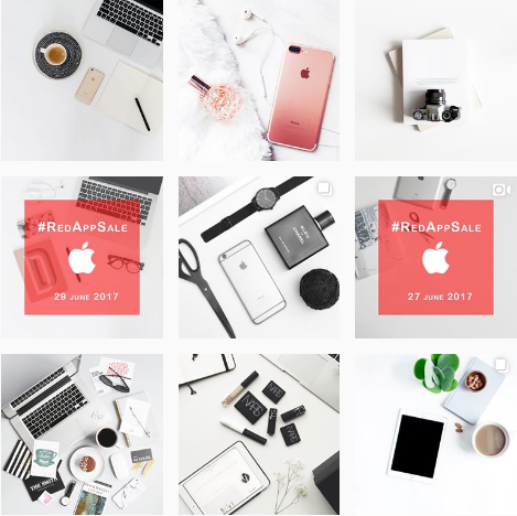 На этапе планирования мы разработали контент-план, систему хэштегов и внешний вид аккаунта. Весь профиль было решено наполнять Flat Lay снимками с гаджетами Apple и простыми заливками.