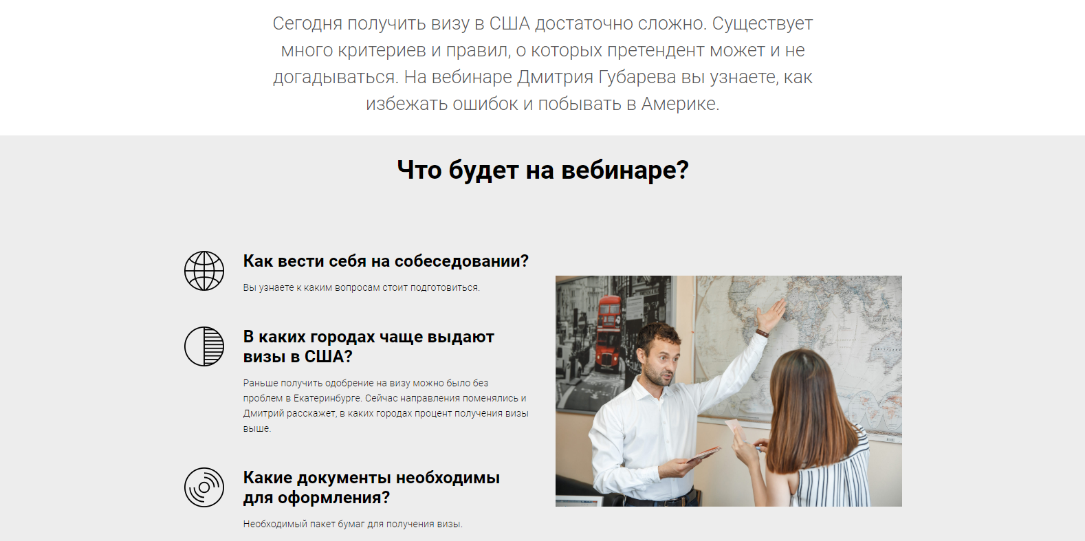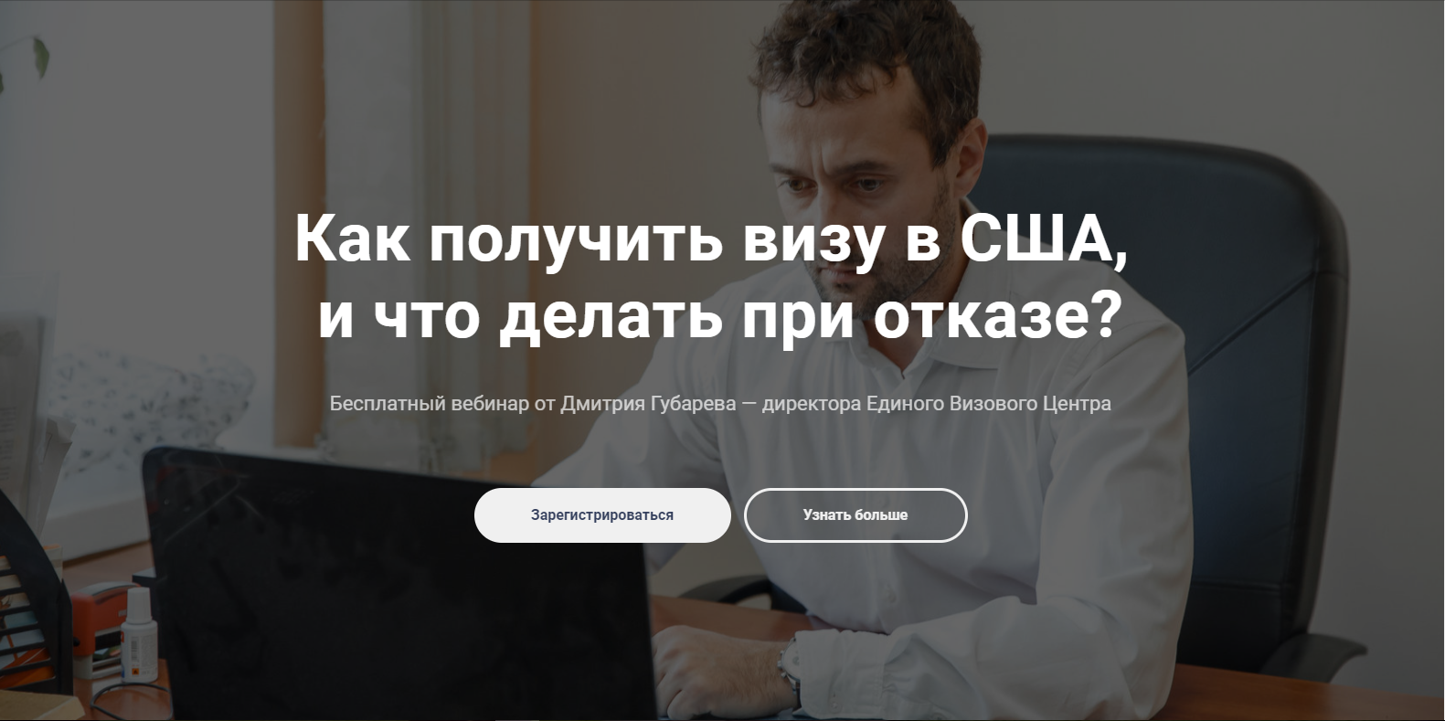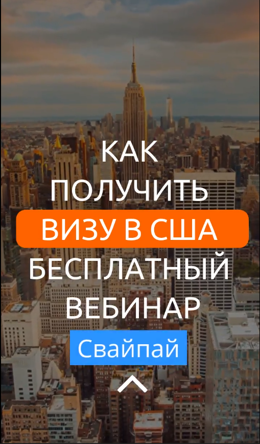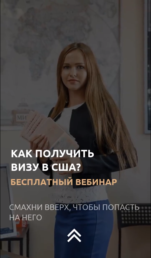 Реклама в Stories с ссылкой на лендинг позволяет получить большее число заявок, за счёт того, что на лендинге размещается много подробной информации о мероприятии (в нашем случае — вебинар по визе в США), а также, например, указаны выгоды участия пользователя в вебинар